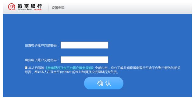 平台注册成功后,系统提示需要开通存管账户。点击开通存管账户,实名认证以后输入银行卡号和开户银行,点击签约,跳转徽商银行界面设置交易密码,即可成功开通存管账户。