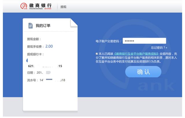 在徽商银行存管账户提现时,输入提现金额,点击确认提现后,跳转至徽商银行界面,输入交易密码即可申请提现。此外,与充值过程类似,部分平台在提现过程中不会跳转至徽商银行界面,而是通过第三方机构提供的支付通道实现账户提现功能。