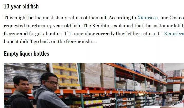 在Costco,有顾客会把用了四年的床垫拿回来要求退换。最离谱的是,有一位女顾客从Costco买了一条鱼,结果忘记吃,13年后拿回来退货,说是过期了!