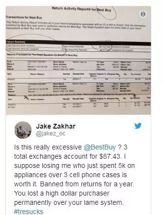 据报道,在一家Best Buy,一位41岁的男子Jake Zakhar,在退了三次手机壳之后,被告知在一年内禁止进行任何退货或换货。