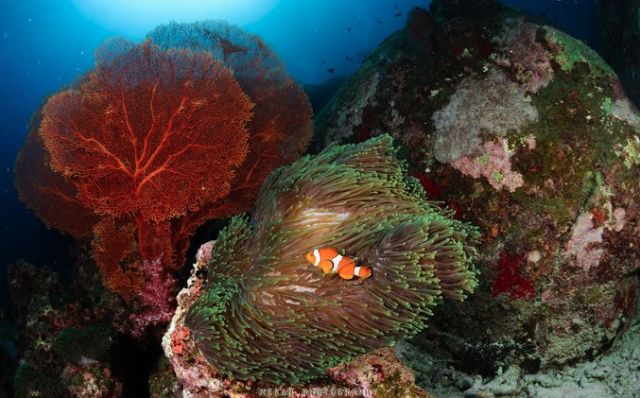 经石头通道往下拐右,在深度大约25米左右的大石头上面有非常多的红色海扇和珊瑚,在30米左右的沙地上有很多色彩艳丽的软珊瑚,这里有很大机会找到彩虹鳗,潜点难度也不大。