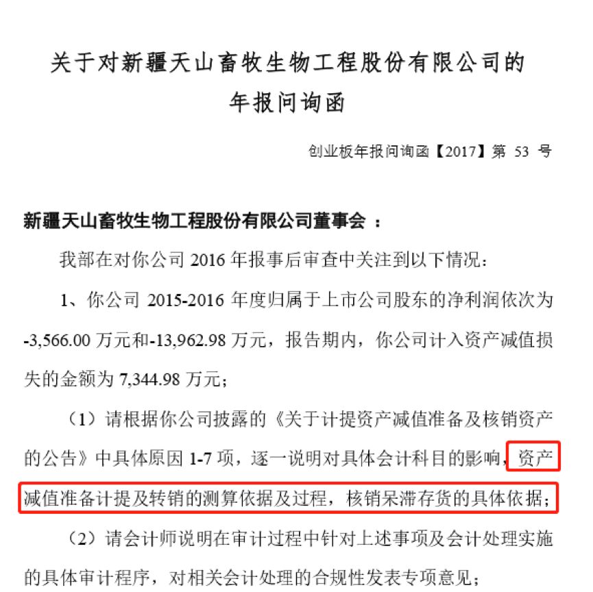于是,深交所对天山生物2016年年报发出了问询函,要求公司说明“资产减值准备计提及转销的测算依据及过程,核销呆滞存货的具体依据;并请会计师说明在审计过程中针对上述事项及会计处理实施的具体审计程序,对相关会计处理的合规性发表专项意见”。