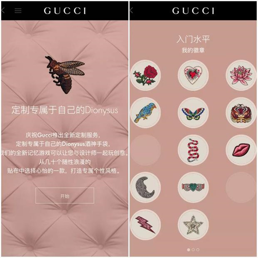 近年来把图腾和服装完美融合的Gucci也没有错过这个宣传机会。它在自己的app中设置了一个“酒神包”DIY的小游戏,每赢一次就会获得一个图腾徽章。据玩用户评论,这种设计刺激了很多消费者的收藏欲望,有利于消费者更加了解该系列服装。