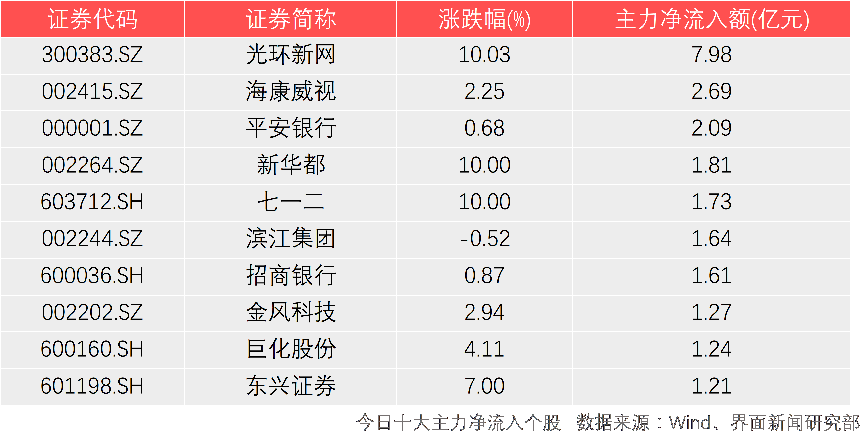 从个股表现上来看,今日主力资金净流入排名前三的是光环新网(300383.SZ)、海康威视(002415.SZ)、平安银行(000001.SZ),分别净流入7.98亿元、2.69亿元、2.09亿元。今日主力资金净流入排名前十的个股主要集中在信息技术和金融行业。工业互联网概念光环新网获主力近8亿资金流入,临近午盘即涨停。阿里巴巴概念新华都(002264.SZ)、次新股七一二(603712.SH)获主力抢筹涨停。