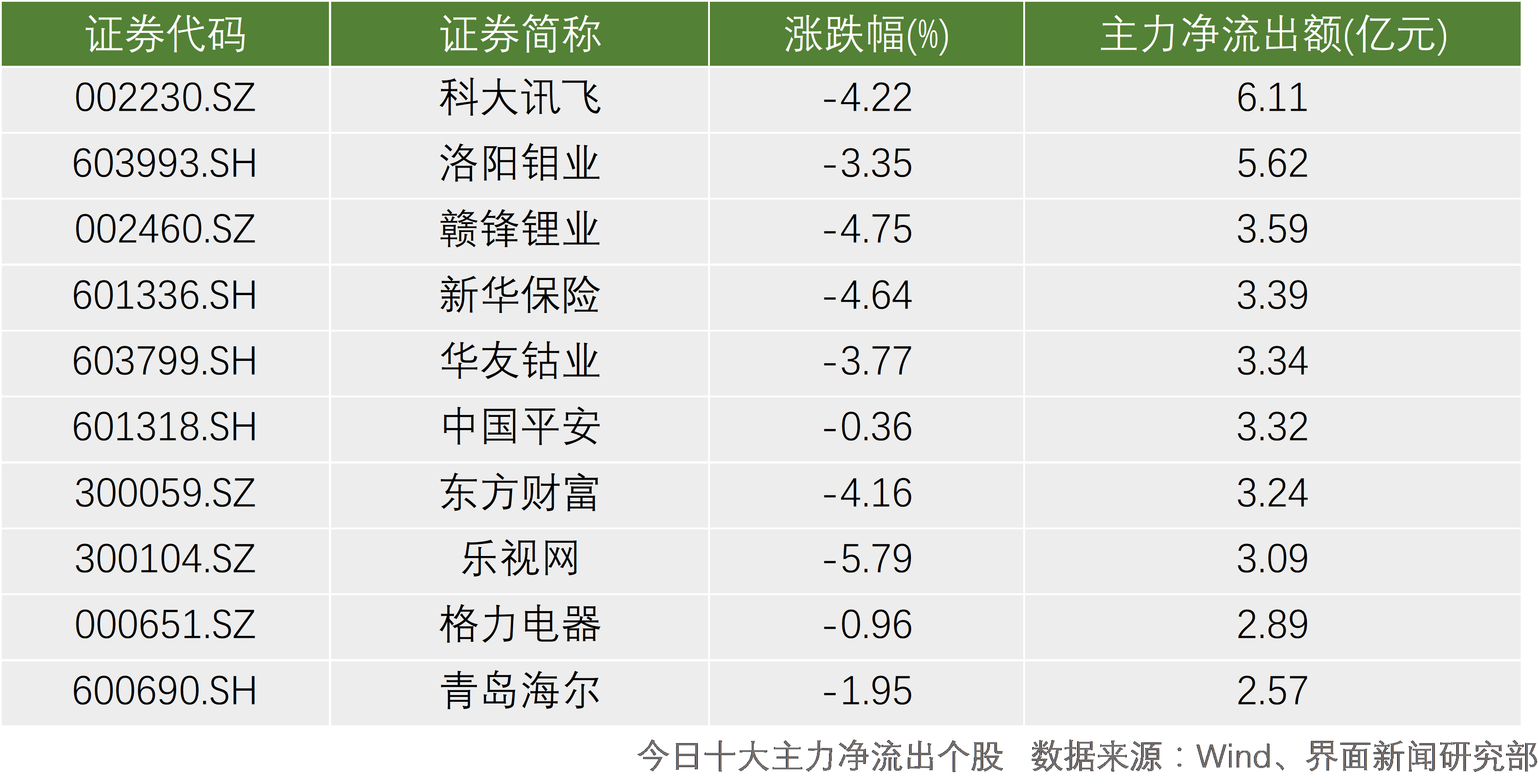 科大讯飞(002230.SZ)、洛阳钼业(603993.SH)、赣锋锂业(002460.SZ)成为主力资金今日重点抛售对象,分别净流出6.11亿元、5.62亿元、3.59亿元。今日主力资金净流出排名前十的个股主要集中在材料和金融板块。科大讯飞、洛阳钼业、华友钴业(603799.SH)、格力电器(000651.SZ)延续昨日遭遇主力抛售态势,今日仍位列主力资金净流出个股排名前十。