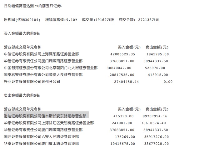 卖出金额中,财达证券佳木斯长安东路卖出8971万元乐视网股票位列第一。