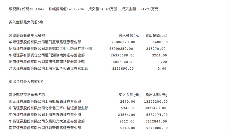 3月19日,乐视网跌停,日跌幅偏离值达-11.20%成交金额2.43亿元。其中,买入金额最大的为华泰证券厦门厦禾路,买入2688.6万元,卖出6408元。华福证券厦门湖滨南路买入2639.67万元,卖出3204元。