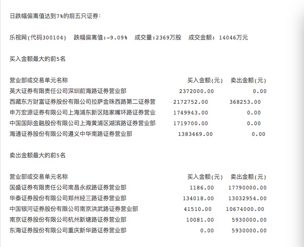3月16日,乐视网跌停,当日乐视网跌幅偏离值达-9.09%,成交金额1.41亿元。其中,买入金额最大的为英大证券深圳前海路为237万元。但卖出金额中,国盛证券南昌永叔路卖出1779万元,华泰证券郑州经三路卖出1303万元。