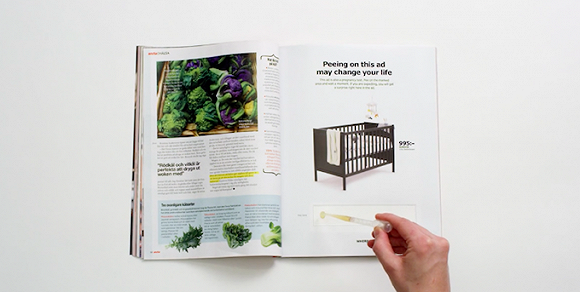还记得2个月前我们报道过的宜家报纸广告吗?一张有验孕试纸功能的杂志内页,上面写着“尿在这张广告上能改变你的生活。”——只要准妈妈把尿液滴在内页中、拿着确认怀孕的内页去当地宜家,就可以获得婴儿床折扣。