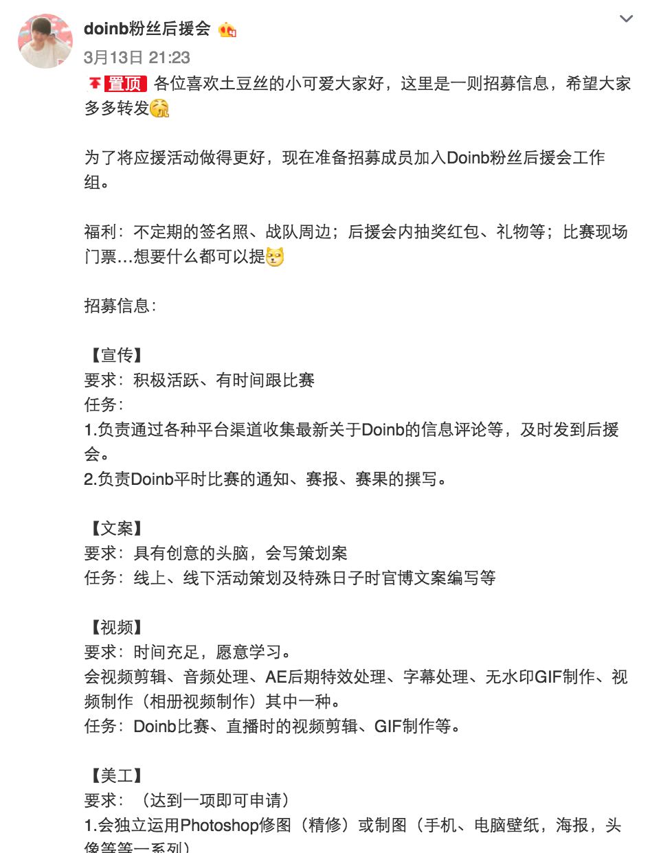 电竞粉丝组织甚至迅速专业化起来,后援会招聘包括宣传、文案、视频、美工等各工种,除了签名照等“福利”,并无任何实质性报酬。