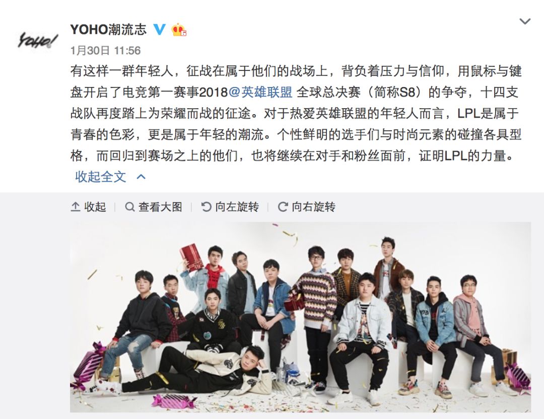年前,《YOHO潮流志》还给电竞选手们拍摄了一组硬照,“个性鲜明的选手们与时尚元素的碰撞各具型格”,“电竞男团”初具雏形: