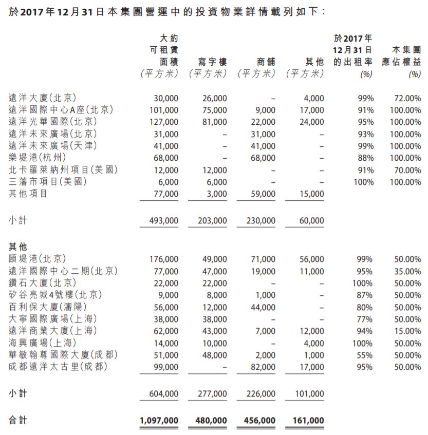 远洋集团年报显示,2017年,远洋集团物业投资营业额9.77亿元,同比去年增加10%。