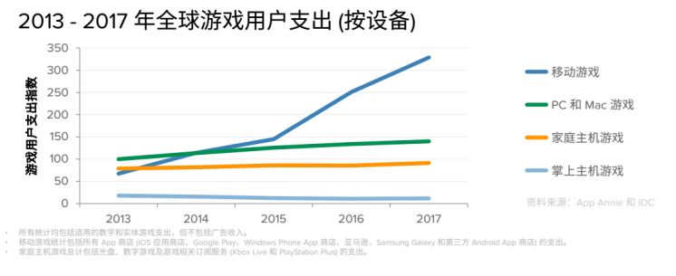 报告指出,随着2014年移动游戏超越PC和主机游戏成为用户支出的最高类别后,移动游戏就一直保持着相当稳定且突出的增长趋势,2017年也毫不例外,依旧在不断拉大和其他类别的差距。2017年,移动游戏的用户支出已经达到了PC和Mac游戏支出的2.3倍,家庭主机的3.6倍。