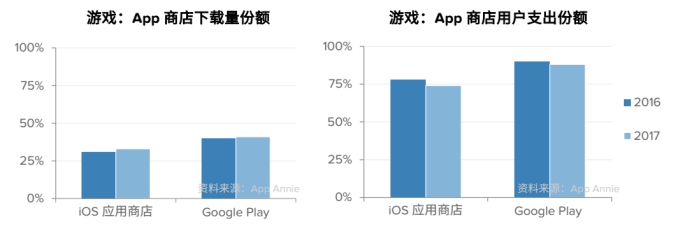 并且还值得关注的一点是:2017年游戏占了全球iOS应用商店和Google Play综合应用商店下载量约35%,但所占收入却达到了80%,其中iOS应用商店收入高出Google Play综合应用商店近两倍。