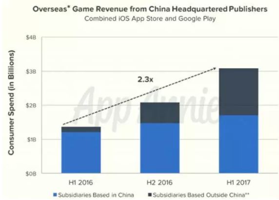 值得一提的是2017年中国移动游戏出海对iOS应用商店和Google Play的下载份额和收入都做出了不小的贡献。早在2017年上半年,AppAnnie就对中国游戏出海做过分析,分析发现,2017年上半年,中国移动应用发行商的海外收入超过了30亿美元,约为2016年上半年的两倍还要多。