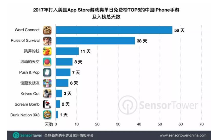 而在SensorTower的数据分析中也显示了,2017年期间打入美国App Store游戏类单日下载榜TOP5的共176部iPhone手游中,总共有九款由中国开发商制造推出,数量占比约5.1%。相比2016年占比增长了2.3%,可以说2017年是中国移动游戏出海的黄金一年也不为过。