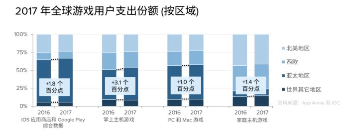 按地区来讲,2017年各游戏类型中,除家庭主机游戏外,其他几种类型游戏用户支出份额增长最快的都是亚太地区,其中手游增长1.8个百分点,掌上主机游戏增长3.1个百分点,PC和Mac游戏增长1.0个百分点。而亚太地区掌上主机游戏用户支出份额增长的主力为日本地区。