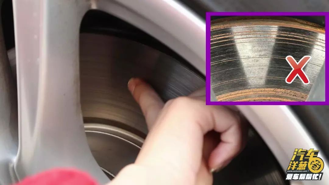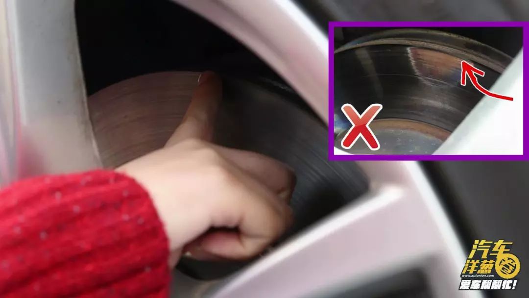 圈圈建议啊,自己检查的时候谨慎起见,还是上手去摸一下,如果说摸到刹车盘的外侧有凹槽,感受一下这个凹槽,最多最多深2毫米,大概就是跟一个硬币差不多厚吧。记住,这是极限!