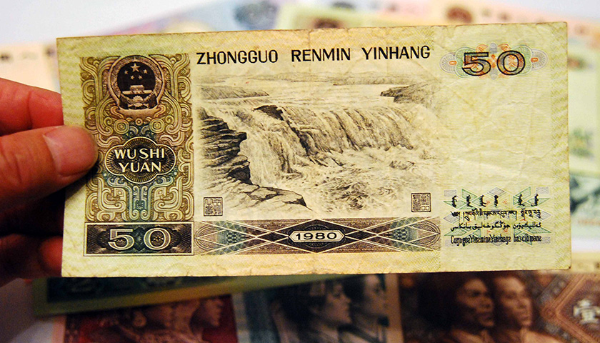 (二)第四套人民币50元纸币。其主色调为黑茶,正面图案为工人、农民、知识分子头像,背面图案为黄河壶口。