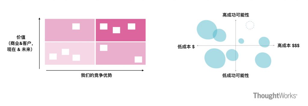 选择哪两个维度绘制矩阵取决于具体的业务。例如“价值”与“竞争优势”,适用于企业所提供的产品或服务在市场中面临激烈竞争的场景;“成本”与“成功可能性”,适用于在高不确定性领域的探索创新投资;还有其他的比如“效率”与“质量”、“价值”与“风险”等。