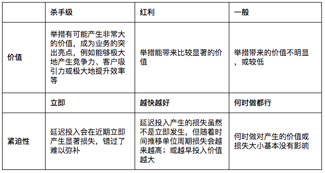 粗颗粒度:类别应当是粗粒度的,上面表格中的分类在大多数场景下都满足这个条件。粒度越细,机会和投资的动态变化越不确定;在外部环境改变时,过细粒度的投资比例模型会约束团队对新机会的响应速度;相对独立:用于指导投资分配的类别,彼此之间应相对独立。在某一个特定的投资决策层级上,应尽量避免问题类别归属含混模糊,给决策造成困难;关注比例:赋予不同类别以投资比例,比为每个类别分配绝对投资额上限更有意义。对总额上限的控制只有在实际投资超过其额度时才有意义,而投资比例更能传递出组织的投资策略,可以随时对各个方向的投入情况进行比较。相对于给出每个方向上一个“合理”的绝对数额,从战略出发决定不同方向上的投资权重这种方式,因为不需要前期对未来投资具体要做的工作进行过多预测,要容易得多,从而也减少了组织浪费在前期计划上的精力;实时反馈:按类别分配投资的意义不仅仅是约束,更是提供实时反馈。企业需要有技术手段对每个类别上的投资进行持续、实时的统计,将实际发生与期望比例进行比较,将投入与实际成效进行比较,触发决策层进行原因分析并做出调整:哪些方向上投资过多?哪些过少?是市场发生了新的变化?是否应该干预后续投资节奏?投资举措的优先级排序