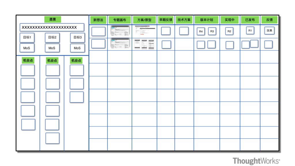 有效进行投资组合管理,需要可视化管理:要让每个提出想法和解决方案的负责人,不仅仅只了解自己的工作,也了解其他人在做什么以及和自己有什么关系;理解全局优化而非局部博弈;并让管理者实时了解各项举措的计划和进展,从而能够实时进行协调决策并提供支持。一个良好的实践是,采用看板方法将整个投资组合可视化出来,提高管理透明度。如下图所示,选择一个众人容易看到的地方,在一堵平整的墙面上,将整个领域或产品内投资组合的全貌展示出来,持续更新内容和状态。