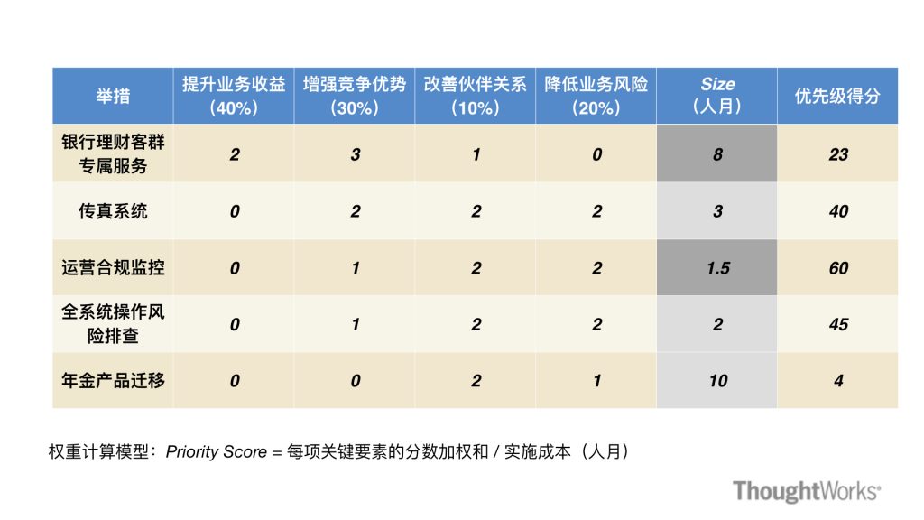 由投资组合管理的干系人或委员会,就每项举措对每一个关键价值要素的影响进行评分,得分为0~3分。0分代表没有任何贡献或影响,3分则有巨大的贡献或影响,1分和2分则介于之间。另外,为了创造价值而付出的机会成本也必须要考虑的因素之一,这里机会成本包括数字化产品的研发投入,也包括其它资源、市场和运营相关投入。如果简化一点,只考虑研发投入,则可以使用估算的人力和时间。将各个关键价值要素的得分乘以其权重求和,再除以实施成本,则得到一个粗略的优先级分数。这个方法符合精益原则,它驱动解决方案的设计者采用更简单的解决方案创造更大价值,以小批量方式投入。