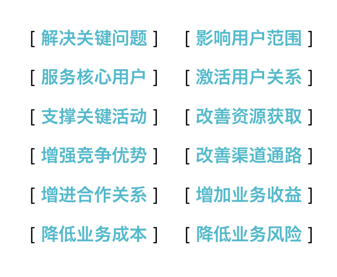 “价值”是决定优先级的最重要因素,但价值这个概念不具体,什么是价值?带来收入是价值,降低成本也是价值,这是一个综合概念。为了理清思考价值的标准,我们尝试识别出了12个常见的价值要素: