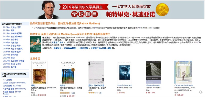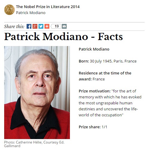 欧洲中部时间(CET)10月9日下午1点(北京时间晚上7点),瑞典皇家学院公布了2014年诺贝尔文学奖得主。最为大家所期待的日本作家村上春树仍然没有得奖,而是法国作家帕特里克·莫迪亚诺(Patrick Modiano)获得了评委会的青睐。