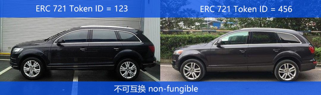 而同一辆奥迪Q7在卖出的一瞬间就成为不可互换的两辆车,因为他们的主人会用不同方式驾驭这辆Q7。如上图,即使车型、配置、出厂时间和售价一样,不同车主驾驶保养方式也会让其价值立刻不同。如果每辆Q7都代表一个ERC-721标准的Token,它们是独一无二不可互换、不可分割的,“non-fungible”。