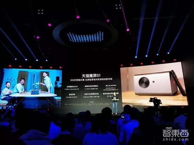 第二款设备是天猫魔屏S1投影机,它搭载了AliGenie 2.0系统,可以和天猫精灵一起使用。浅雪介绍到,该投影机1.8米距离就可以投射100吋的大屏观影效果,莫非这是进入无屏电视市场的节奏?