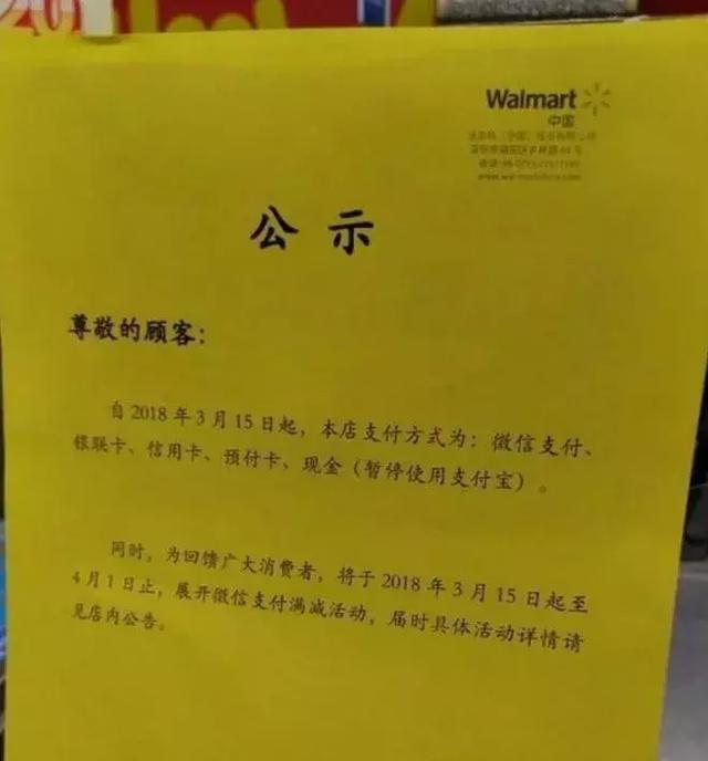 今日,IT内参后台收到网友爆料,称部分地区的沃尔玛超市现已张贴公告,决定自3月15日起便停止支持支付宝支付通道,仅支持微信支付。