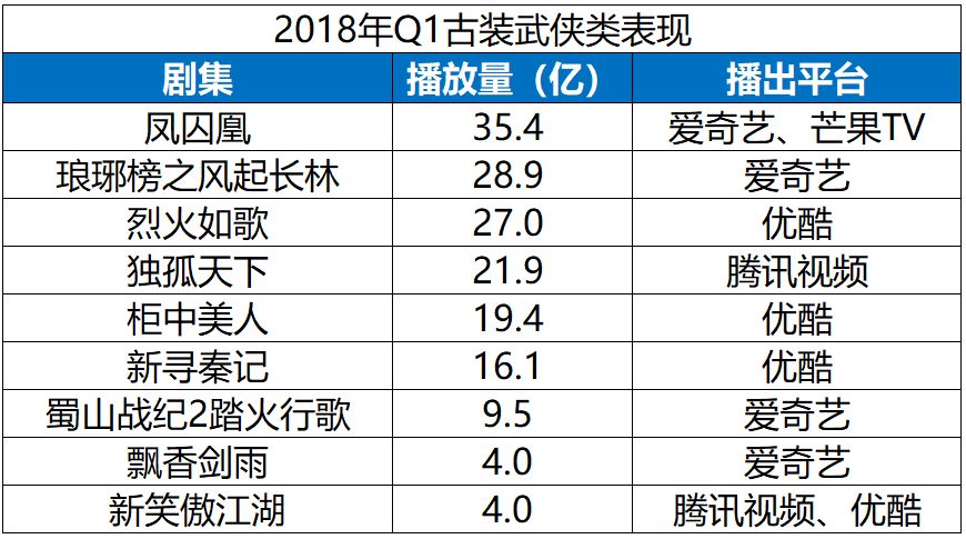 古装大女主由盛转衰的受益对象,并不仅仅是现代题材——历史正剧、古装权谋、新武侠这三个系类也开始逆势上扬。从一季度上映的9部古装剧来看,除了与芒果TV联播的流量TOP1《凤囚凰》,其他三部传统古装大女主,爱奇艺都未涉及,转而将独播资源迁移到《琅琊榜之风起长林》、《飘香剑雨》、《蜀山战纪2》中。