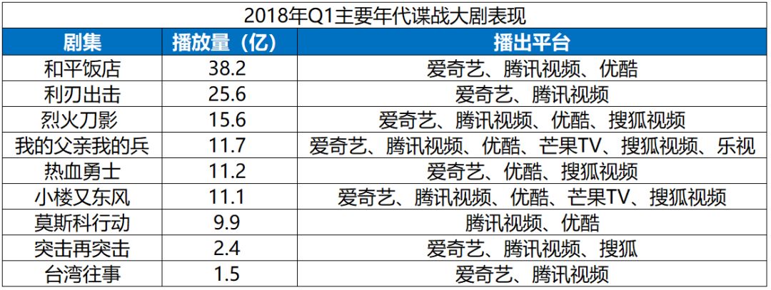 据统计,今年一季度上马的9部主要谍战大剧中,爱奇艺和腾讯视频各自拿下8部,优酷揽下6部。从这9部谍战大剧的播放平台看,每部作品都至少有两家第一梯队的视频网站,可见此领域激战正酣。