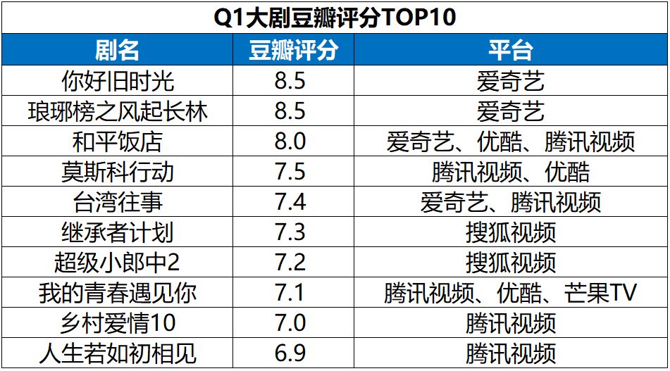 纵观2018Q1大剧豆瓣评分前十,爱奇艺包揽前三,在前五名中也占据四个席位。腾讯视频则占据6个位置,独播的《乡村爱情10》和《人生若只如初见》评分在7分上下。优酷上榜的三部高口碑剧均为版权剧,且均属联播,换句话说,独播剧的口碑哑火值得深思。