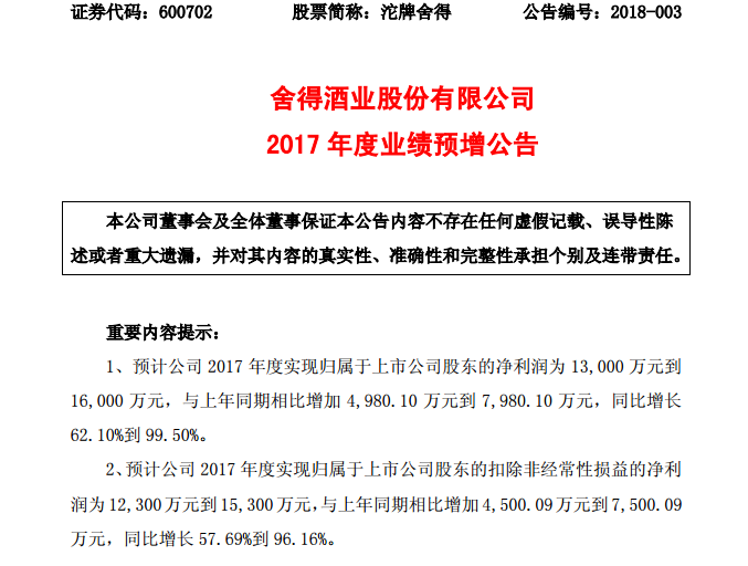 根据舍得酒业此前发布的2017年业绩预告显示,公司预计实现归属于母公司的净利润为1.3亿元-1.6亿元,同比增长62.10%-99.50%。