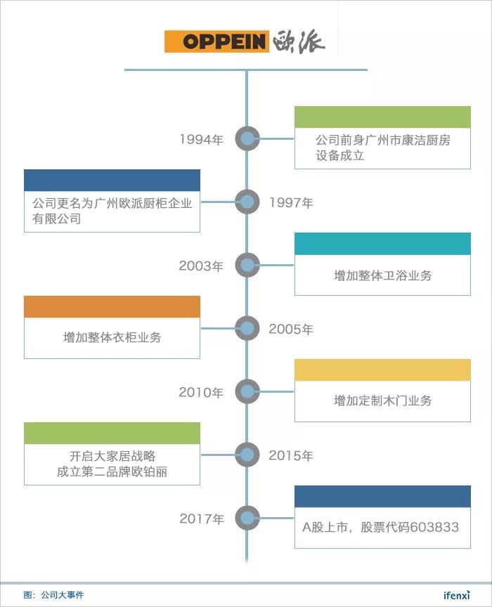 欧派家居(以下简称欧派)成立于1994年,前身是康洁厨房设备有限公司,是国内最早引进整体橱柜概念的生产制造企业,凭借先发优势及良好运营能力,一直保持着整体橱柜行业的领先地位。此后,欧派陆续开拓了卫浴、衣柜、木门等新品类;2011年开始规划大家居战略,2015年正式启动。