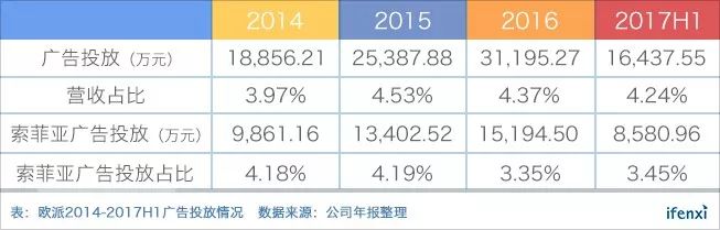 庞大的线下门店网络除了获客以外,也直接充当了欧派的品牌推广媒介。此外,明星代言、媒体推广等方式也是欧派品牌宣传重要手段,欧派每年的广告投放的营收占比在4%左右,与衣柜领头者索菲亚水平相当,但从绝对值上来看,接近索菲亚两倍,优势明显。随着第二品牌欧铂丽、大家居概念等推出,短期内预计欧派在广告方面的投放力度只增不减。