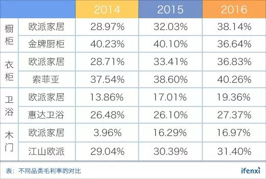 此外,在某些新品类上,相比行业其他公司,欧派的毛利水平还有提升空间。橱柜业务方面,对比自营模式占比超过50%的金牌厨柜,欧派在2016年的毛利率已经超越金牌。加上欧派未来主推第二品牌欧铂丽,毛利空间相对更小,因此橱柜业务毛利率增长空间有限。衣柜品类,对比行业第一索菲亚,还有5%左右增长空间。木门、卫浴等品类毛利水平也相对处于低位,未来提升空间较大。