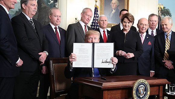 按:北京时间3月23日0时50分许,美国总统特朗普在白宫正式签署对华贸易备忘录。特朗普当场宣布,有可能对从中国进口的600亿美元商品加征关税,并限制中国企业对美投资并购。