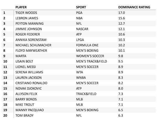 在这份榜单中,美国高尔夫选手泰格·伍兹以17.0的优势率排名第一,他曾在1999至2008年间一举拿下13个大满贯冠军,比其他高尔夫选手多了整整10个;排名第二的是NBA球星勒布朗·詹姆斯,作为联盟首位也是目前唯一一位生涯累积30000分、8000篮板、8000助攻的球员,他的优势率达到了15.6;第三名来自于NFL,是以539记传球达阵和71940码传球推进创造联盟里程碑式记录的佩顿·曼宁,其优势率为12.7。