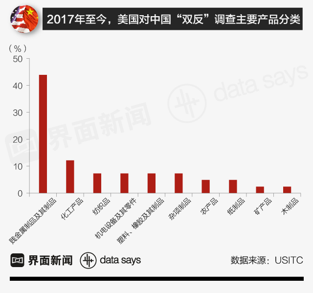 受贸易摩擦影响最大的行业是中国钢铁、铝等贱金属及制品及化工产品、机电产品等行业,美方对其发起的贸易调查最多。