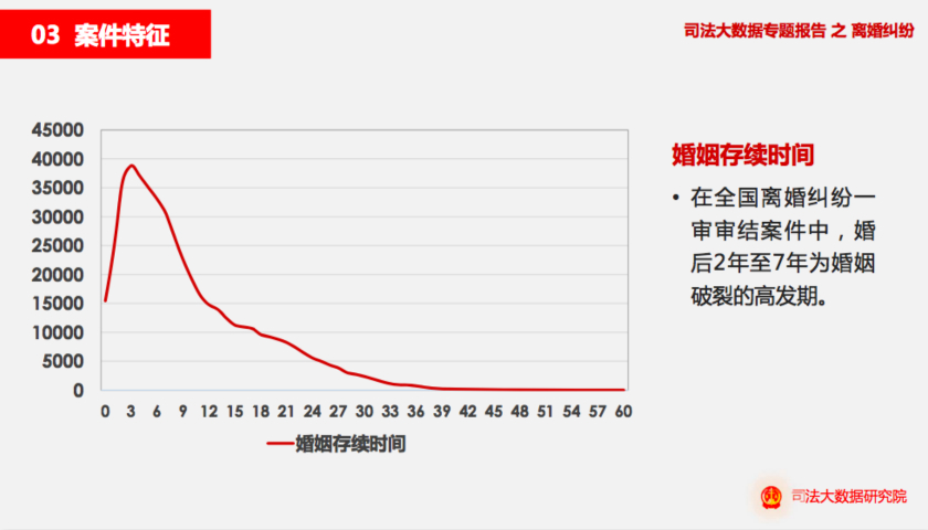 最高人民法院3月22日对外发布的司法大数据离婚纠纷专题报告显示,2017年全国离婚纠纷年度一审审结案件量为140余万件,较2016年略有上升。其中从婚姻存续时间来看,在全国离婚纠纷一审审结案件中婚后2年至7年为婚姻破裂的高发期。