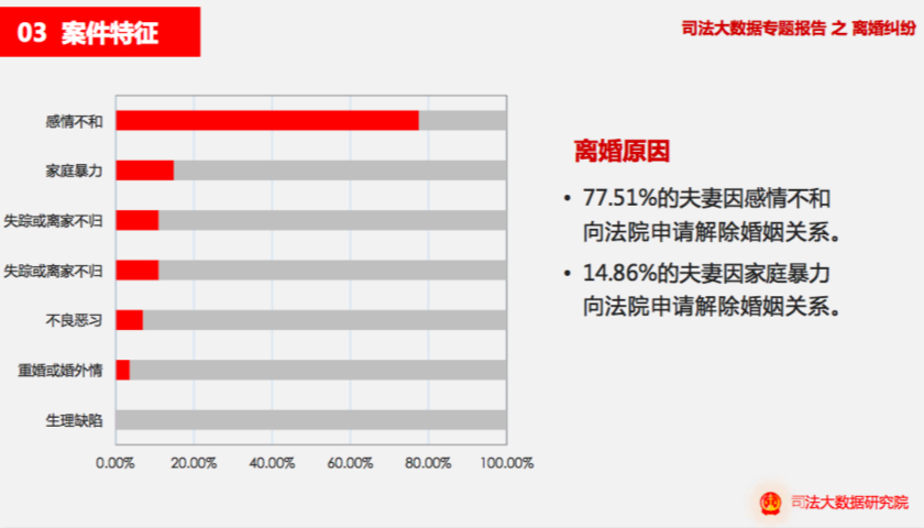 此外,在离婚原因方面,77.51%的夫妻因感情不和向法院申请解除婚姻关系,14.86%的夫妻因家庭暴力向法院申请解除婚姻关系,其他的夫妻离婚则是因为失踪或不归家、不良恶习和重婚或婚外情等原因。