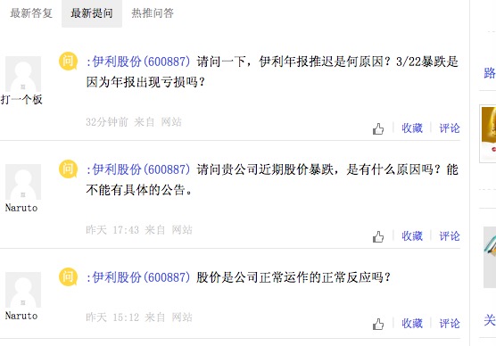 在上证e互动平台上,诸多投资者就公司股价下跌进行了提问,询问3月22日暴跌是否因年报出现亏损所致。3月23日下午,伊利股份董秘办相关人员对界面新闻记者表示:“伊利股份2017年年报的确出现了推迟,将在2018年4月27日公布。”据了解,伊利股份年报本应于3月31日发布。对于年报推迟发布的原因,该工作人员表示:“因为做不完,所以会推迟。”