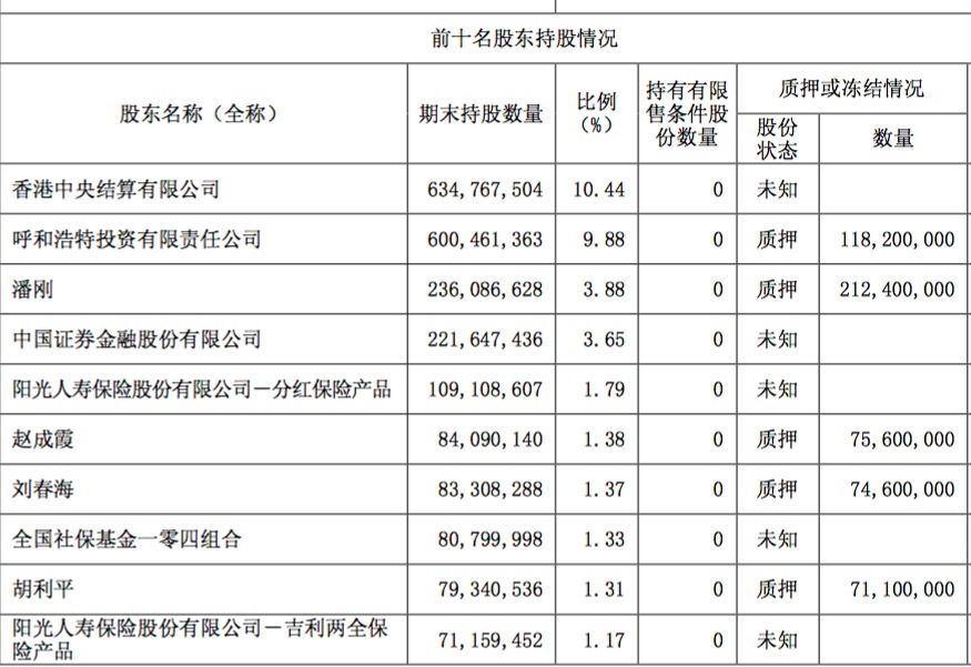 从股权质押的情况上来看,截至2017年第三季度,第二大股东呼和浩特投资有限责任公司持股比例9.88%,质押比例达到19%。伊利集团董事长兼总裁潘刚为第三大股东,持股数量2.361亿股,持股比例3.88%,质押2.124亿股,质押比例达89.96%。