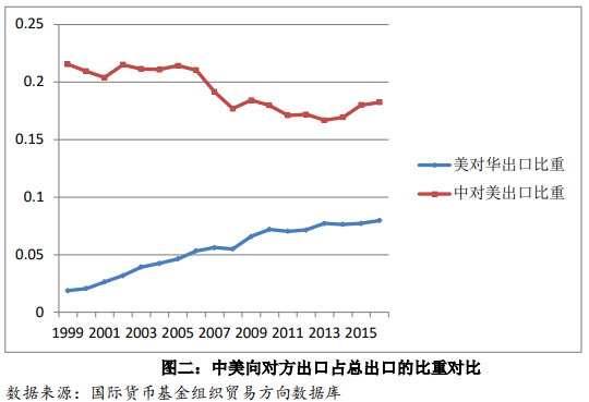 我们再来看看图二。这里展示的是美国出口中到中国的比重,以及中国出口中到美国的比重。数据是货物贸易数据。1999年,中美签订中国加入世贸组织协议的时候,中国出口中有21.55%是输往美国,美国的出口中有1.87%是输往中国。到2016年,中国出口中有18.24%是输往美国,美国的出口中有7.96%是输往中国。其实在2013年,中国对美出口比重一度下降到16.69%。