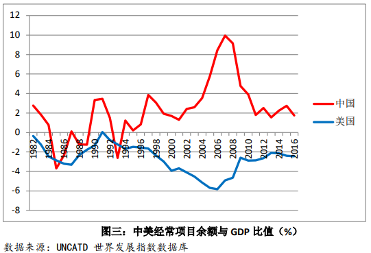 实际上,当前美国和中国的整体经常项目失衡相比十余年前,已经有比较大的改善。如图三所示,中美的经常项目差额与国内生产总值的比值都在缩小。虽然中美双边贸易差额比较集中,但双方的多边失衡状态都已经有很大改善。