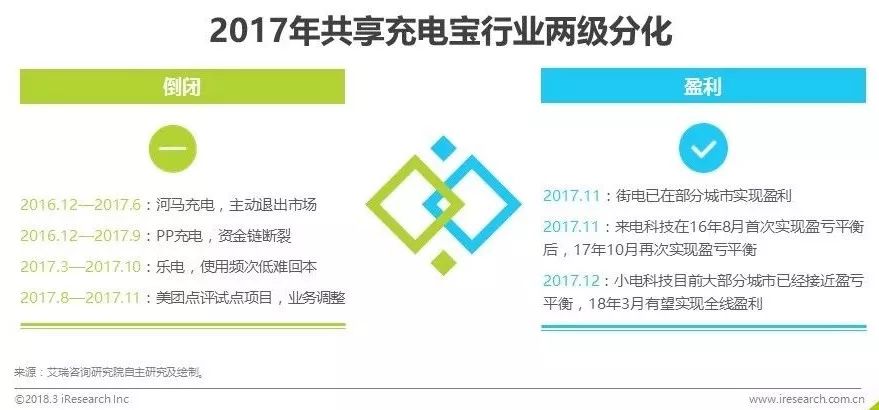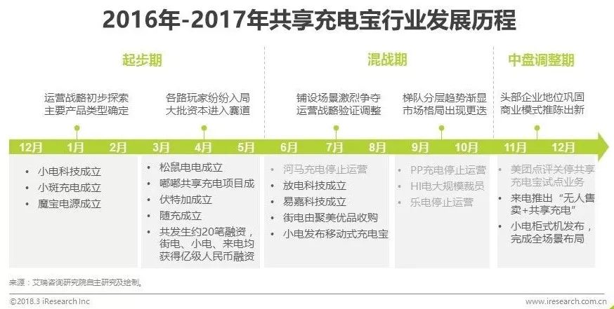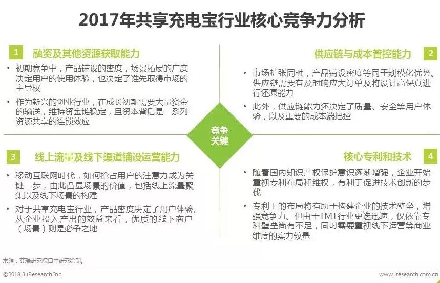 回顾2017,共享充电宝作为共享经济领域的又一风口行业,从发展初期商业逻辑的饱受质疑,到资本入场后的高歌猛进,再到尾部企业的纷纷阵亡,短短一年间便完成了行业的迅速迭代与梳理,由狂热回归冷静。艾瑞咨询认为,共享充电宝行业已进入中盘调整期,头部企业和二三线企业的差距逐步拉开,经过这一轮的淘汰休整在2018年有望形成新的市场格局,而在如今这一动荡的敏感时期,如何夯实自身综合竞争实力成为关键。