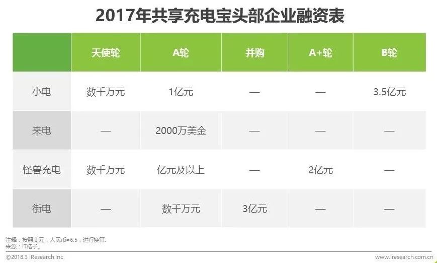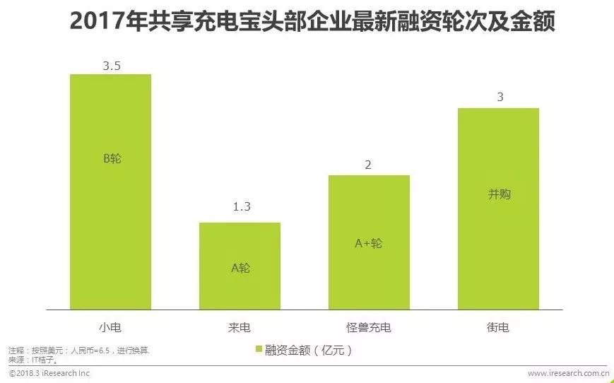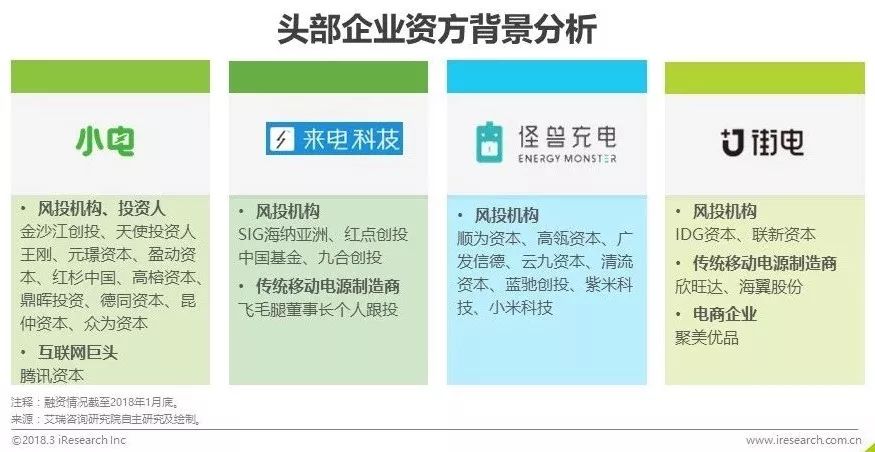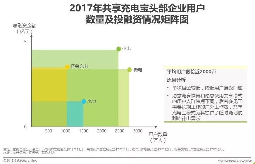 融资方面,行业整体仍处于中早期阶段,但头部企业的段位逐步拉开。小电在17年上半年共完成4.5亿元融资,最新一轮融资3.5亿元,怪兽充电以2亿元的A+轮融资紧随其后。来电获SIG海纳亚洲、红点创投中国基金领投,九合创投、飞毛腿董事长个人跟投的2000万美元A轮融资。街电则在2017年5月获聚美优品3亿元战略投资。